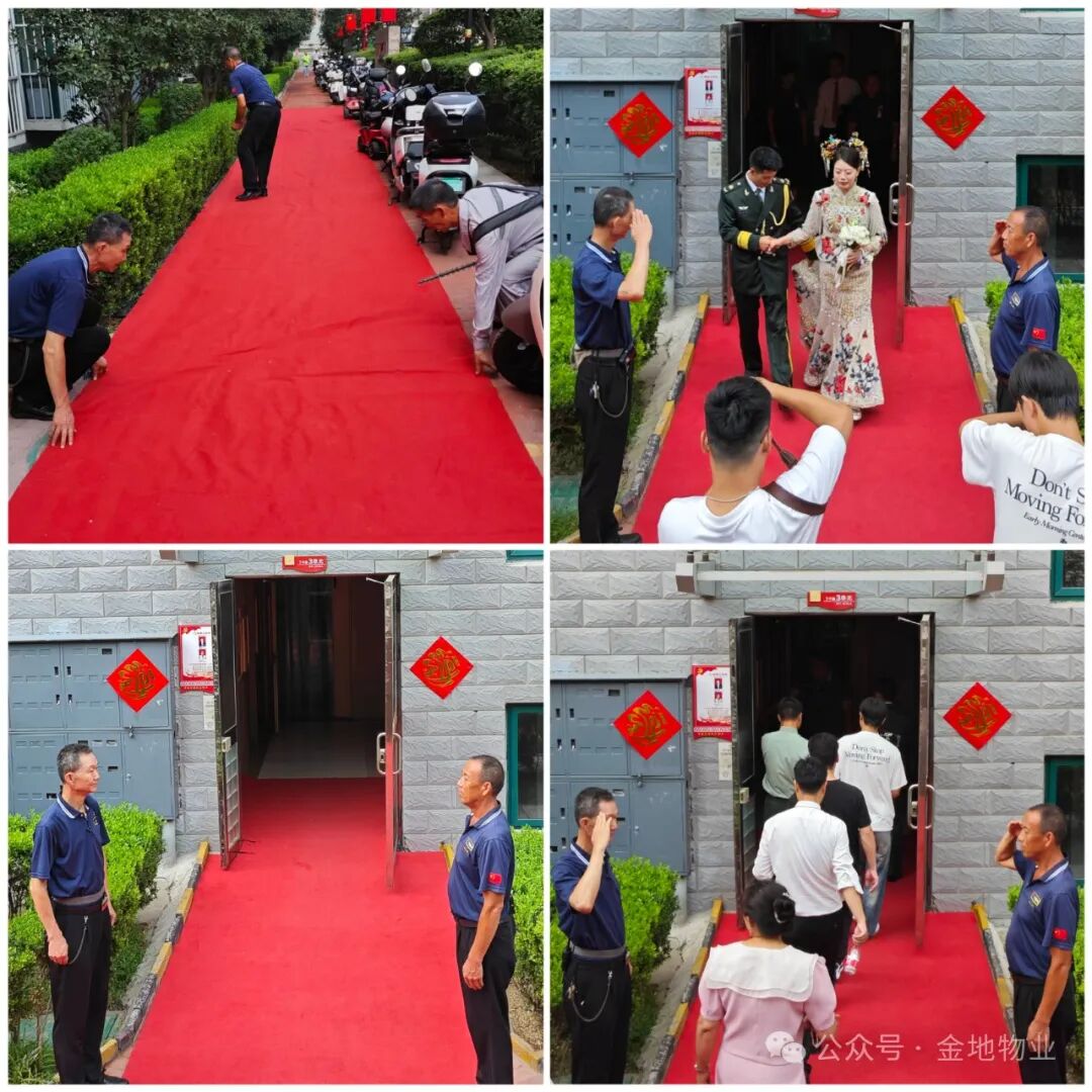 八月份金地物业服务中心收到了小区业主家有喜讯的消息,业主新婚当日物业人员在单元门口铺好红地毯,为他们送去美好祝福。