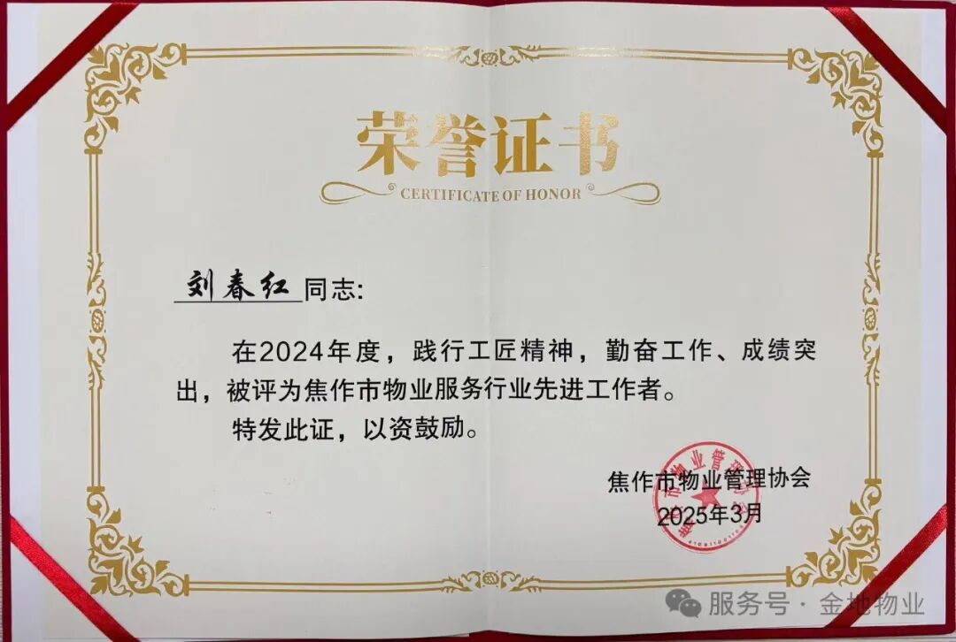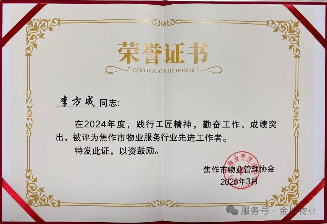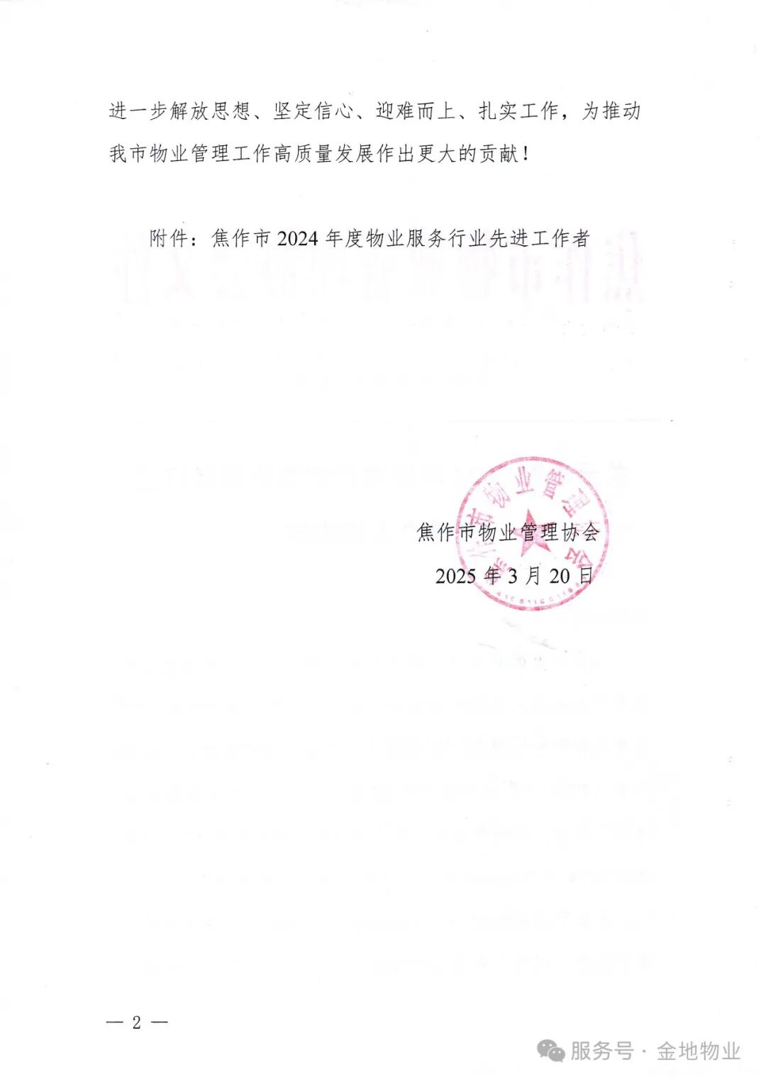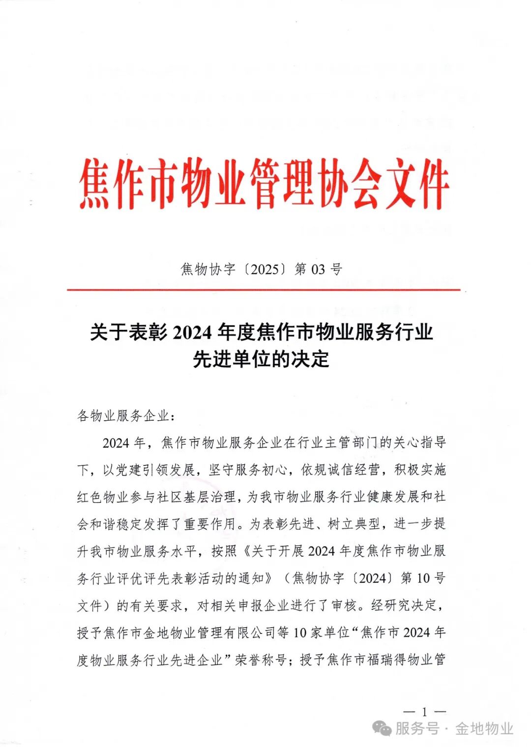 3月28日,焦作市物业管理协会在迎宾馆召开了第四届理事会第一次全体会议。在此次会议上,对2024年度表现卓越的会员单位进行了表彰。金地物业公司荣获“2024年度物业服务行业先进企业”的荣誉称号。